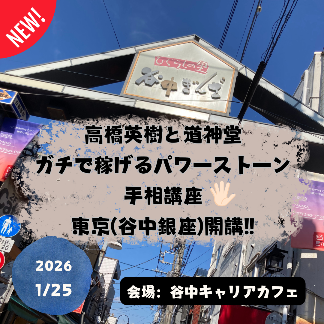 ご都合の良い日からスタートOK!! ◎広島 昼講座 9:30~12:30 夜講座 19:00~22:00 2025年12月8日(月)・9日(火) 2026年1月23日(金) ◎埼玉(ひばりヶ丘) 夜講座 15:00~18:00 2025年12月15日(月)・16日(火) ※2026年から会場は谷中銀座に変更 ◎東京(谷中銀座) 昼講座 10:00~13:00 夜講座 15:00~18:00 2026年1月25日(日) ◎福島 15:00~18:00 ・講師:高橋英樹 2025年12月17日(水)・18日(木) 2026年1月:予定なし ・認定講師:樋野由希江 2026年1月:予定なし ◎沖縄 13:00~17:00 ※日程はお問い合わせください。 ※まだの方は、 こちらのフォローもお願いします。 手相イベント情報グループ |